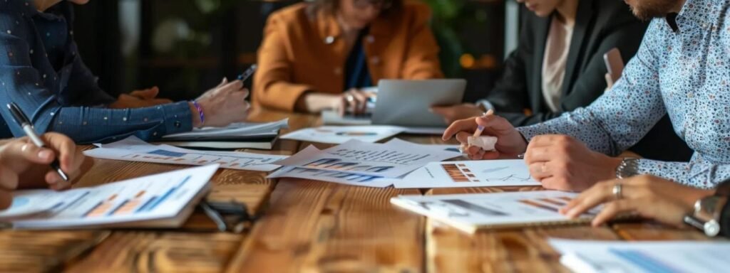 Alt text: Business professionals collaborating on documents at a table, focusing on strengths and differentiators in their discussion.