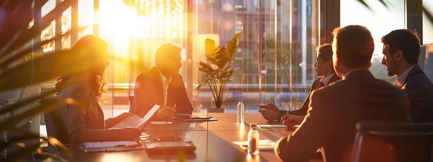 Alt text: A group of business people at a conference table, illuminated by sunlight from the window, reviewing the top response for RFP.